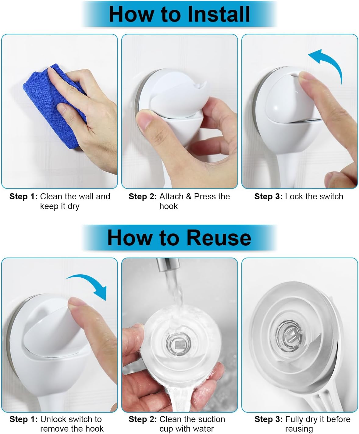 - ☺️Easy 3-Step Installation: No tools, no screws, no nails and no damage to your walls! Simply clean and dry a smooth, non-porous surface, attach the suction cup, and lock the switch. Watch the video of our suction cup hook or follow the manual for detailed instructions.